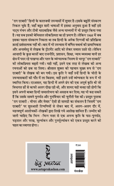 ‘राग दरबारी’ हिन्दी के कालजयी उपन्यासों में शुमार है। इसके बहुतेरे संस्करण निकल चुके हैं; जहाँ बहुत सारी भाषाओं में इसका अनुवाद हुआ है वहीं इसे नाट्य मंचन और टीवी धारावाहिक जैसे अन्य माध्यमों में भी प्रस्तुत किया गया है। यह सब इसकी बेमिसाल लोकप्रियता का ही प्रमाण है। लेकिन 1968 में जब इसका पहला संस्करण निकला था तब हिन्दी के अनेक दिग्गजों की प्रतिक्रिया क़तई प्रशंसात्मक नहीं थी। बाद में भी उपन्यास में वर्णित यथार्थ की प्रामाणिकता और अन्तर्वस्तु से लेखक के ट्रीटमेंट आदि को लेकर सवाल उठते रहे। लेकिन आज़ादी के कुछ बरसों बाद राजनीति, प्रशासन, शिक्षा, न्याय व्यवस्था यानी हर क्षेत्र में पसर रहे पाखण्ड और पतन के व्यंग्यात्मक चित्रण से भरपूर ‘राग दरबारी’ की लोकप्रियता बढ़ती गयी। यही नहीं, इसने एक तरह से लेखक की अन्य रचनाओं को ढक सा लिया। श्रीलाल शुक्ल की पहचान मुख्य रूप से ‘राग दरबारी’ के लेखक की बन गयी। इस कृति ने जहाँ उन्हें हिन्दी के चोटी के उपन्यासकारों की पाँत में ला बिठाया, वहीं इसने उन्हें व्यंग्यकार के रूप में भी स्थापित किया। दरअसल, यह हिन्दी में अपने ढंग की एक अपूर्व कृति थी जो विधागत ढर्रे से काफी अलग दीख रही थी, और शायद यही वजह रही होगी कि इसने अपनी बाबत हिन्दी समालोचना को असहज कर दिया; यह भी कह सकते हैं कि उसके सामने पुनर्पाठ और पुनर्विचार की चुनौती पेश की। प्रस्तुत पुस्तक ‘राग दरबारी: मीनार और मेयार’ ऐसी ही सामग्री का संकलन है जिसमें ‘राग दरबारी’ पर शुरुआती टिप्पणियों से लेकर बाद में, अलग-अलग दौर में, महत्त्वपूर्ण आलोचकों-लेखकों द्वारा लिखे गये आलेख शामिल हैं। उम्मीद की जानी चाहिए कि भिन्न-भिन्न नज़र से एक अनन्य कृति के पाठ पुनर्पाठ, पड़ताल और परख, मूल्यांकन और पुनर्मूल्यांकन को एकत्र प्रस्तुत करने की पहल का स्वागत होगा।